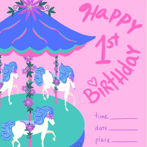 Cavalos de carrossel caprichosos, flores roxas exóticas e videiras azuis-esverdeadas para seus convites de Feliz Primeiro Aniversário, cartões de agradecimento, pôsteres e muito mais.