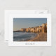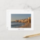 Cartão postal da arquitetura típica das antigas casas construídas na praia do Mar Mediterrâneo, na cidade de Cefalu, na ilha da Sicília, em Itália, com uma fronteira branca, e do texto Sicília.