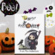 Prepare-se para uma festa de Halloween incrível com este convite alegre em aquarela! O design apresenta um Ceifador divertido caminhando por um cemitério assustador, segurando sua foice, enquanto um corvo preto se empoleira no topo de uma caveira. “Feliz Halloween” aparece em estilo festivo com uma abóbora Jack-o-Lantern, um chapéu de bruxa, teias de aranha, uma lua cheia brilhante com um morcego voando e um fantasma assustador, a mistura perfeita de diversão e charme arrepiador.