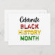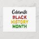 Um cartão postal BHM com CELEBRATE BLACK HISTORY MONTH em tipografia vermelha, amarela, verde e preta na frente e saudação PERSONALIZÁVEL no verso, que você pode mudar para sua saudação preferida (ou excluir completamente). Material de papelaria, decoração caseira, material de festa e vestuário disponível na coleção MÊS DO HISTÓRICO NEGRO por Designs Bereanos.