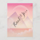 Cartão de agradecimento com uma ilustração encantadora e adorável. Cores pastéis de rosa e pêssego. Cena de paisagem com planetas, montanhas e nuvens.