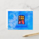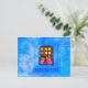 Um elegante conjunto de chá no nicho de uma janela de um edifício medieval. Bule de chá pontilhado de vermelho e branco, jarro de leite, uma xícara e um pires, bem como uma tigela de açúcar estão colocados no profundo parapeito da janela de um antigo edifício de igreja que agora serve como uma loja de igreja. Parede azul escura e uma luz laranja quente na janela. Apenas uma bela composição bem na rua. Fotografia estilizada e texturizada para aquecer o seu coração na noite de inverno. Você é bem-vindo para beber chá quente.