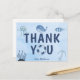 Cartões de agradecimento para chá de bebê na praia. Lindo cartão de agradecimento com tema de animais marinhos em aquarela azul, apresentando um salva-vidas náutico como o O em VOCÊ. Animais costeiros fofos rodeiam sua mensagem personalizada, incluindo uma baleia e um peixe sob o mar.