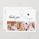 Crie seu próprio cartão postal de agradecimento para o chá de bebê com uma fotocolagem linda para agradecer aos amigos e familiares por receberem seu pequeno! O design elegante e minimalista apresenta uma colagem de três fotos personalizadas na parte inferior e tipografia elegante na parte superior com sua mensagem de "obrigado" em uma fonte sofisticada e as informações do seu bebê em uma fonte simples e moderna. Há também um pequeno coração feito no ar por uma borboleta. No verso, há uma mensagem personalizável com os nomes dos membros da sua família e seu endereço de devolução em tipografia moderna. Torne-o único substituindo o texto e as imagens clicando no botão "Personalizar". Este cartão de agradecimento é neutro em termos de gênero e perfeito para apresentar um menino ou uma menina!