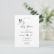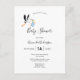 Um simples cartão de convite para chás de fraldas celebrando um bebê. Um fundo branco na moda, letras pretas. Com uma cegonha voadora segurando um bebê. Personalize e adicione o nome da futura mãe e os detalhes da sua festa. Traseira: design de cartão postal comum.