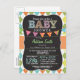 O convite neutro para chás de fraldas com um quadro cônico fofo parece fonte em um padrão colorido de estilo laranja, verde, amarelo e azul lacrimogêneo. Vintage sente fontes de giz no fundo legal da lousa com bandeiras coloridas cor-de-rosa, laranja, roxo e bunting verde.