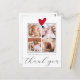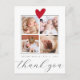 Este modelo de cartões de agradecimentos de quatro fotos da faculdade apresenta um visual elegante preto e branco nítido, preto e branco, com uma abertura de cor vermelha. Ele apresenta quatro das suas fotos favoritas de bebês, um cabeçalho de "obrigado você" na caligrafia elegante de script, e o nome e a data de nascimento do seu bebê na fonte chic. As fotos feitas são amarradas por um delicado quadro quadrado e um coração vermelho, parecendo uma caixa de presentes coroada por um arco! Simples e imaginativo! O reverso apresenta o seu obrigado personalizado que você envia e um pequeno coração. Use as ferramentas intuitivas de design, suas fotos favoritas e sua inspiração, e faça com que esse chá de fraldas de colagem multifoto, elegante e minimalista / novo cartões de agradecimentos de anúncio de bebê seja exclusivamente seu!