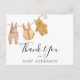 Obrigado seus convidados por comemorar a mamãe! Esta obrigado que você faz no postal mostra uma ilustração adorável de roupas de bebê neutras em relação ao gênero penduradas em uma linha de roupas. Personalize com suas informações ou clique em "Clique para personalizar mais" para editar estilos de fonte, tamanho e cores.