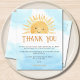 Obrigado familiar e amigos por terem vindo ao seu chá de fraldas com este obrigado de chá de fraldas giro que você faz. Diz obrigado na tipografia na moda com um adorável sol amarelo de aquarela num fundo azul-céu. A mensagem é personalizável. Original Watercolor © Michele Davies.