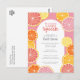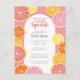 Frutas cítricas caprichosas em cores de limão, rosa, coral, laranja e toranja vermelha rubi. As fatias de cítricos desenhadas à mão incluem uma textura pintada à aquarela para uma adição suculenta ao convite colorido do chá de noiva.