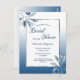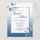 Na frente: um clássico fundo ombre azul e branco gradiente com um falso quadro prateado. Decorado com galhos botânicos, florais em tons de azul. Modelos para o nome da noiva e detalhes da festa. O nome e o texto: Chá de panela são escritos com um script de estilo manuscrito, letras azuis coloridas. Verso: gradiente azul clássico. Dica: Se você não quiser que pareça um cartão postal, clique em personalizar, vá para o verso e remova o divisor e o carimbo de posto.