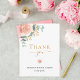 Um cartões de agradecimentos moderno e elegante. Um fundo branco chic. Decorados com ouro rosa e rosa-rosa pincelada, folhas de eucalipto florais, florais e verdes, cor-de-água, prigos, verde e ouro falso. Letras pretas e ouros. Na frente do texto: Obrigado, nome e data. Back: Modelo para sua nota de agradecimento e seu nome.