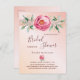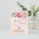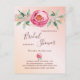 Um fundo rosa dourado e cinza rosa-claro. Rosa cor-de-rosa grande, folhas verdes, folhagem com flores ouros pequenas. O texto: Chá de panela é escrito com um script de estilo com letras grandes. Personalize e adicione um nome e detalhes da parte. Letras rosa escuras de cor dourada. Traseira: Rosa dourado, fundo cor-de-rosa pincelado. Dica: Se você não quiser que pareça um cartão postal, clique em personalizar, vá para o verso e remova o divisor e o carimbo de posto.