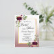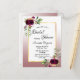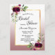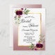 Na frente: Um rosa de canela, fundo de gradiente branco com uma falso estrutura dourada. Decorados com flores escuras e burgosas, rosas, penas e verde ao estilo do bô. Modelos para o nome da noiva e detalhes da festa. O nome e o texto: Chá de panela são escritos com um script de estilo manuscrito, letras pretas. Fundo: fundo e rosas de gradiente de rosa de canela. Dica: Se você não quiser que pareça um cartão postal, clique em personalizar, vá para o verso e remova o divisor e o carimbo de posto.