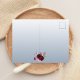 Na frente: um fundo azul tendencioso, gradiente branco com uma estrutura geométrica dourada falsa. Decorados com flores, rosas e penas do estilo "boho" escuras e burguesas. Modelos para o nome da noiva e detalhes da festa. O nome é escrito com um script de estilo manuscrito, letras pretas. Dica: Se você não quiser que pareça um cartão postal, clique em personalizar, vá para o verso e remova o divisor e o carimbo de posto.