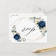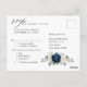 Cartão postal azul-marinho escuro para o casamento floral RSVP com buquê elegante de azul-marinho, azul-real, branco, ouro, marfim de champanhe, rosa de cor-de-rosa, hydrangea, ranunculus, pénia, botões de flores e folhas de eucalipto verdes-sábio e uma elegante cor-de-água com estrutura neutra geométrica arredondada. Entre em contato comigo para obter ajuda sobre a personalização ou se você precisar de outro produto com este design.