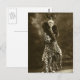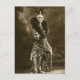 Fotografia vítrea de uma jovem numa combinação de chapéu e casaco que são perfeitamente horríveis. O chapéu tem um boné que ajustado toda a cabeça com um caule e uma atrocidade ondulante e balançante de um chapéu. O casaco é algum tipo de pelo animal com pelo preto liso ao redor da coleira. O fundo tem uma aresta irregular que parece que pode ser a aresta não aparada do pelo animal original