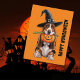 Esta é uma imagem gerada por IA. Eu queria fazer um design de cesto de halloween. Achei que seria legal tê-lo vestindo o chapéu de uma bruxa. Eu queria que ela lhe trouxesse a boca. A sua imagem saiu melhor porque o cão tem um punho de lanterna na boca.