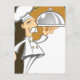 Design castanho e branco com um cozinheiro de chapéu alto e avental segurando um prato coberto de vapor em sua mão