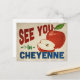 Um cartão postal encantador da viagens vintage Cheyenne Wyoming com uma adorável maçã vermelha, juntamente com um texto divertido no estilo retrô que diz, "Até mais em Cheyenne"