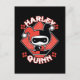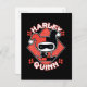 Confira Chibi Harley Quinn enquanto ela faz as divisões em frente a um pano de fundo de diamante de bolinhas vermelha com seu nome escrito em volta dela.