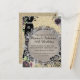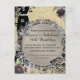 Um vestido preto chic num pano de fundo dourado com flores roxas com espirais decorativas combinadas com um círculo deslizante com prata floresce onde você pode personalizar seu evento. elegância na moda feminino.