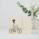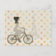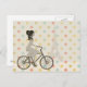 Chic e modernos, presentes personalizados e acessórios com uma garota elegante andando de bicicleta com a Toalha Eiffel ao fundo. Imagem limitada por padrão de bolinhas multicolorido.