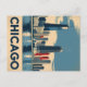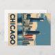 Um poster retrô ilustra o horizonte de Chicago com arranha-céus proeminentes e a frente d'água, renderizado em uma paleta de cores azul, vermelha e bege, com "CHICAGO" escrito ousadamente na parte inferior.