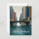 A beautiful graphic illustration capturing the Chicago Riverwalk, featuring stylized skyscrapers, a classic bridge, and the reflective, textured blue water.