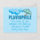 Pluviófilo: amante da chuva; alguém que encontra alegria e paz de espírito durante os dias chuvosos. Belo design de chuva azul com um guarda-chuva bonito e nuvens de tempestade sobre a definição. Um cartão postal de previsão do tempo.