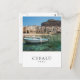 Cartaz fotográfico de dois barcos no antigo pequeno porto de Cefalu, uma velha cidade com casas tortas na frente d'água e uma pequena praia urbana na costa norte da Sicília, ilha italiana com uma caixa branca com o texto "Cefalù, Sicília" e linhas verdes, brancas e vermelhas, as cores da bandeira italiana.