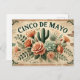 Aqui está um elegante cartão postal de viagens vintage ao estilo aquarela de Cinco de Mayo, com um refinado design de inspiração mexicana com delicados rosas, marigolds e cactos em pinceladas de aquarela suaves e fluentes. 🎉 🌿 ✨ A design tem cores mudas, sofisticadas, com a graciosa tipografia da escrita, que lê "Cinco de Mayo".