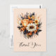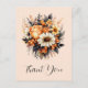 Obrigado postal com um buquê de flores elegante e gótico. Compostos por tulipas de laranja, margaridas amarelas, folhas de cinza e alvéolos e alguns acentos de orango.