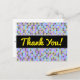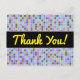 Este design de cartão postal apresenta um padrão abstrato em forma de grade de quadrados ou azulejos coloridos em tons de cores como cinza, roxo, bege e azul. Também apresenta a mensagem "Obrigado!" na frente em texto amarelo semelhante a uma escrita à mão, junto com uma mensagem personalizada de agradecimento no verso.