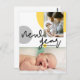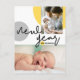 Anuncie o nascimento do seu bebê e deseje a todos uma Feliz ano novo com este cartão postal personalizado de anúncio de nascimento de bebê. Personalize este modelo design com cinza e amarelo com a foto da sua família e do recém-nascido. Edite as estatísticas de natalidade, o endereço de retorno, o nome e a saudação especial no verso deste cartão. Tipografia moderna para as palavras "Novos Começos de Ano Novo".