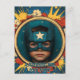 Cartaz excelente para aniversários infantis que adoram quadrinhos e super-heróis. Há um quadro circular com ilustração cômica, que você pode preencher com sua própria foto e seu próprio texto! Este cartão-postal é excelente para celebrar aniversários e eventos escolares para crianças.