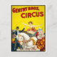 Um anúncio para o Gentry Bros. Circo. O poster retrata um cavaleiro de truques saltando sobre um cachecol mantido por um palhaço e o mestre de operações. Cerca de 1920.