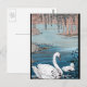 Esta imagem do vintage tem as cisnes brancas bonitas da mãe e do bebê que nadam em um lago em uma cena da natureza da floresta. A ilustração é feita nos azuis, tans e brancos. Veja minha arte da loja daqui até março para produtos de harmonização com este design.