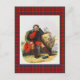 Cartão postal com uma ilustração de aquarela vintage, limpa digitalmente e melhorada, do artista escocês Robert Ronald McIan, datada de 1845. Com o clã Munro tartan, um padrão tradicional de xadrez em vermelho, azul real e verde florestal. Imagem de tartan digital criada por Susan Wallace de Plaidwerx utilizando a contagem de fios fornecida pelo Registro Escocês de Tartans.