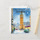 Capture o charme eterno de um inverno em Londres com este cartão postal artístico e personalizável! Este cartão de férias elegante apresenta uma ilustração única do famoso Big Ben (Elizabeth Tower) cercado por uma animada cena de Londres na neve.