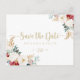 Este clássico de burgundy de ouro, que salva o cartão postal é perfeito para um casamento rústico. A design apresenta a cor-de-água, flores brancas, borrifadas e douradas e bagas com folhagem verde dispostas em buquês elegantes.