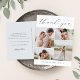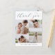 O obrigado de casamento elegante que vocês postcards apresentam quatro fotos organizadas em um layout de colagem em grade. "Obrigado" aparece no topo do roteiro de caligrafia azul-marinho, com seus nomes embaixo em caracteres clássicos de blocos. Adicione uma mensagem pessoal e uma assinatura à parte traseira coordenada por cor.