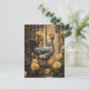 Uma pintura a óleo lindamente detalhada de uma galinha branca e esbranquiçada rodeada por rosas amarelas vibrantes e ferragens em ornamentado. Textura rica e tons de ouro criam uma estética de eterno.