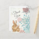 Este cartão postal de agradecimento da primavera apresenta uma mamãe e um bebê coelho. Eles estão sentados entre flores coloridas da primavera.