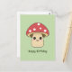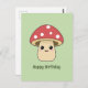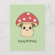 Um cartão postal de aniversário verde com uma ilustração de um cogumelo fofo em estilo cartoon e texto personalizável abaixo! Pode ser perfeito para enviar a uma criança, um micologista ou um amigo que ama personagens Kawaii e natureza!