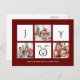 Envie saudações de feriado personalizáveis e customizáveis para amigos, colegas e familiares em cartões simples, elegantes, modernos e sofisticados com design de colagem de 3 fotos em estilo festivo e minimalista natural! Na frente, uma colagem de três fotos cercada pela palavra "alegria" com um rosto de rena fofo em tipografia moderna é apresentada em um belo fundo vermelho-marrom. Abaixo, a caligrafia apresenta sua mensagem de saudação personalizada com o nome da sua família em tipografia moderna.