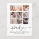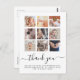 Um lindo cartão de agradecimento de nascimento em estilo moderno com colagem de fotos em grade quadrada, perfeito para apresentar seu pequeno aos familiares e amigos e agradecer pelo apoio durante a gravidez! O design moderno apresenta uma colagem de 9 fotos quadradas personalizáveis. Abaixo, há um cabeçalho de "agradecimento" em uma fonte caprichosa e chique e o nome e as informações do seu bebê, em letras simples. No verso, há uma mensagem personalizável. Através do botão "personalização", você pode substituir as fotos e alterar o texto.