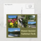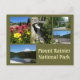 Cartão postal com fotos tiradas no Parque Nacional do Monte Rainier. As fotos incluem Christine Falls, Refletion Lake, a entrada do parque, flores silvestres e Tahoma Creek.