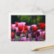 Fotografia floral de tulipas vermelha, rosa e roxa.