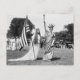 Foto antiga de 1919 do quadro vivant de 4 de julho no Elipse, Washington D.C. mostrando Lady Liberty (o Estado da Liberdade) e Columbia (personificação feminina dos Estados Unidos) com dançarinos e carros antigos.